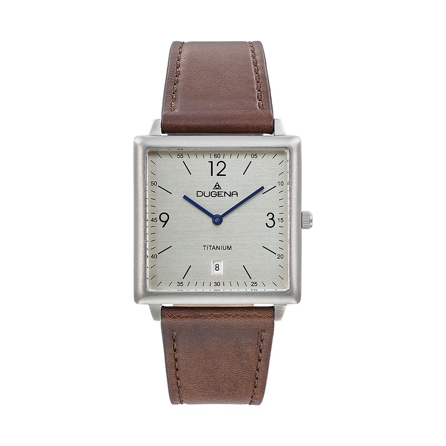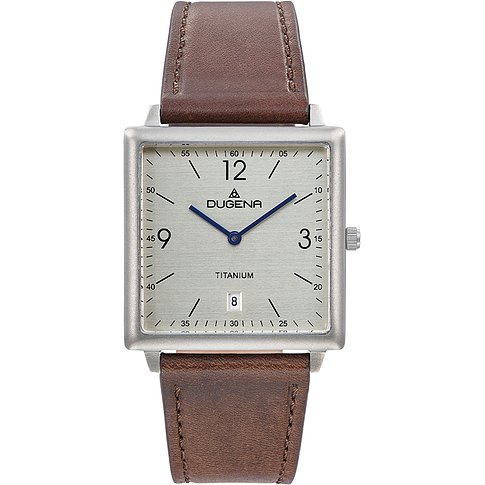 Dugena: Seit über 100 Jahren steht die deutsche Marke für Uhren im Alltag und in besonderen Momenten zuverlässig an deiner Seite. Hochwertige Materialien, modernes Design und eine klare Linie – das sind die Werte, die jede Dugena-Uhr auszeichnen. Egal ob klassisch oder modern, Dugena verbindet Tradition und Qualität für deine Zeit. Diese elegante Herrenuhr ist der perfekte Begleiter für jeden Anlass: Das Gehäuse ist aus Titanen und das Band aus schickem Leder. Für besonderen Chic sorgt das silberne Gehäuse, welches bei der Dugena Mannheim mit einer Lünette in Silber kombiniert und um ein braunes Band sowie ein Ziffernblatt in Creme ergänzt wurde. Ein besonderes Augenmerk ist das eckige Gehäuse mit einer Breite von 34 mm und einer Länge von 34 mm. Die nötige Präzision wird durch ein Quarzwerk gewährleistet. Echt praktisch: Die Mannheim zeigt nicht nur die Zeit an, sondern auch das Datum. Das Uhrenglas aus Mineralglas ist klar und robust – und damit perfekt für den Alltag. Spritzwasser und Regen machen diesem Zeitmesser nichts aus: Er ist bis zu 3 Bar wasserdicht. Praktisch und sicher zugleich: Die Dornschließe sorgt für leichtes Anlegen und guten Halt am Arm. Durch das leicht austauschbare Armband lässt sich der Look der Uhr ganz einfach anpassen und so immer wieder ein neues modisches Statement setzen. Wer seinem Look eine stilvolle Note verleihen möchte, macht mit der Dugena Mannheim Herrenuhr definitiv alles richtig!