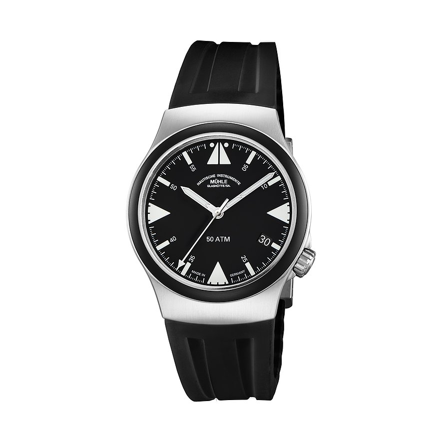 Mühle-Glashütte steht für präzise Zeitmessung seit 1861. Wie kaum eine andere Uhrenmarke repräsentiert das sächsische Traditionsunternehmen die nautischen Tugenden Präzision, Robustheit und gute Ablesbarkeit. Diese Eigenschaften werden vor allem durch die besonders stoßsichere Mühle-Feinregulierung, klar gezeichnete Ziffernblätter und die aufwendige Regulierung nach Chronometernorm garantiert. Die Mühle-Glashütte Einsatzuhren S.A.R. Misson-Timer TITAN ist die optimale Uhr für Herren, die bei Stil und Qualität wissen, was sie wollen. Das Titangehäuse und das Kautschukband ergänzen sich zu einer Sportuhr mit kraftvollem Charakter. Mit einem Gehäusedurchmesser von 43 mm und einer Gehäusedicke von 13 mm gehört diese Mühle-Glashütte zu den auffälligeren, massiveren Uhren, passt aber dennoch zu einer Vielzahl von Handgelenken. Das Gehäuse erhält durch das verwendete Titan einen besonders hochwertigen, Look, dazu ergänzt sich harmonisch die Lünette in Schwarz. Auch bei Dunkelheit lassen sich die Leuchtindizes auf dem Ziffernblatt in Schwarz gut ausmachen, die Zeiger heben sich klar davon ab – für einfache Zeiterfassung auf einen Blick. Ein extrem hartes und kratzfestes Saphirglas sorgt für ungehinderte Sicht. Die Einsatzuhren S.A.R. Misson-Timer TITAN hat eine Wasserdichte von 50 bar und ist damit bestens für alle Abenteuer auf und unter dem Wasser geeignet – ideal für alle Segel- oder Tauchbegeisterten. Das Herzstück der Uhr ist das exzellente Automatikwerk, das sich durch Bewegung selbst aufzieht. Das Band aus Kautschuk in klassischem schwarz zeugt von Understatement und hält die Uhr sicher und komfortabel am Platz. In Summe also eine Mühle-Glashütte wie sie im Buche steht und auch in etlichen Jahren noch für Begeisterung sorgt.