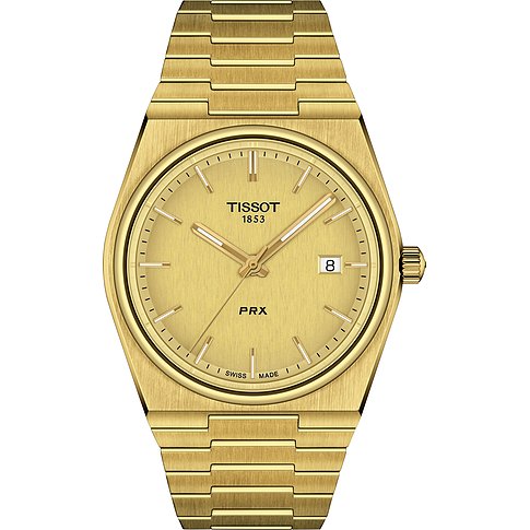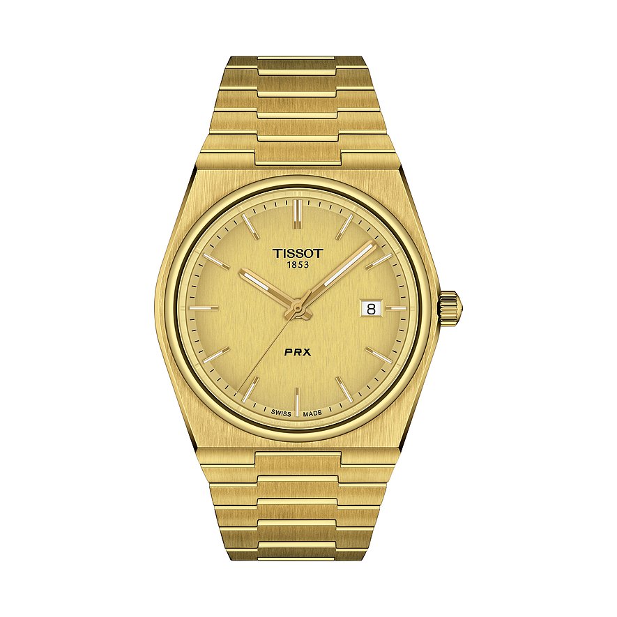 Schweizer Uhrmacherkunst gepaart mit einem erstklassigen Preis-Leistungsverhältnis: Ein Hoch auf Tissot! Handwerkskunst und Qualität, vereint mit Hingabe für Leistung und Präzision, bilden die tägliche Motivation in der Manufaktur aus dem schweizerischen Le Locle. Schon seit 1853 werden hier durch innovative Technologien erstklassige Uhren in vollkommenen Designs geschaffen. Die T-Classic PRX ist die ideale Uhr für alle, die Wert auf Qualität legen und sportliche Eleganz lieben. Ob im Alltag, im Business oder zu besonderen Anlässen: Die exklusive Herrenuhr mit Edelstahl-Gehäuse ist jederzeit ein Statement für guten Stil. Dazu trägt auch das goldene Armband aus Edelstahl bei, das nicht nur robust, langlebig und bequem zu tragen ist, sondern die Uhr auch zu einem echten Kombi-Talent macht. Durch den Gehäusedurchmesser von 40 mm ist die T-Classic PRX an schmalen und mittleren Handgelenken gleichermaßen gut zu tragen. Das champagnerfarbene Zifferblatt mit Markierungen fügt sich gekonnt in das Gesamtdesign ein. Äußerst praktisch: Neben der Uhrzeit verrät ein Blick auf die Uhr auch das Datum. Ein strapazierfähiges Saphirglas übernimmt den Schutz des Zifferblatts. Dieses synthetische, äußerst hochwertige Material ist so gut wie nicht zu zerkratzen und unempfindlich gegen Schläge und Stöße. Das Swiss Made-Quarzwerk ist die Basis für die zuverlässige Präzision dieser Uhr. Mit einer Wasserdichtigkeit bis 10 bar ist die Uhr der ideale Begleiter für Alltag und Abenteuer: Sogar Schwimmen ist unbesorgt möglich! Die Butterfly-Faltschließe verspricht nicht nur sicheren Halt, sondern auch gute Verstellbarkeit.